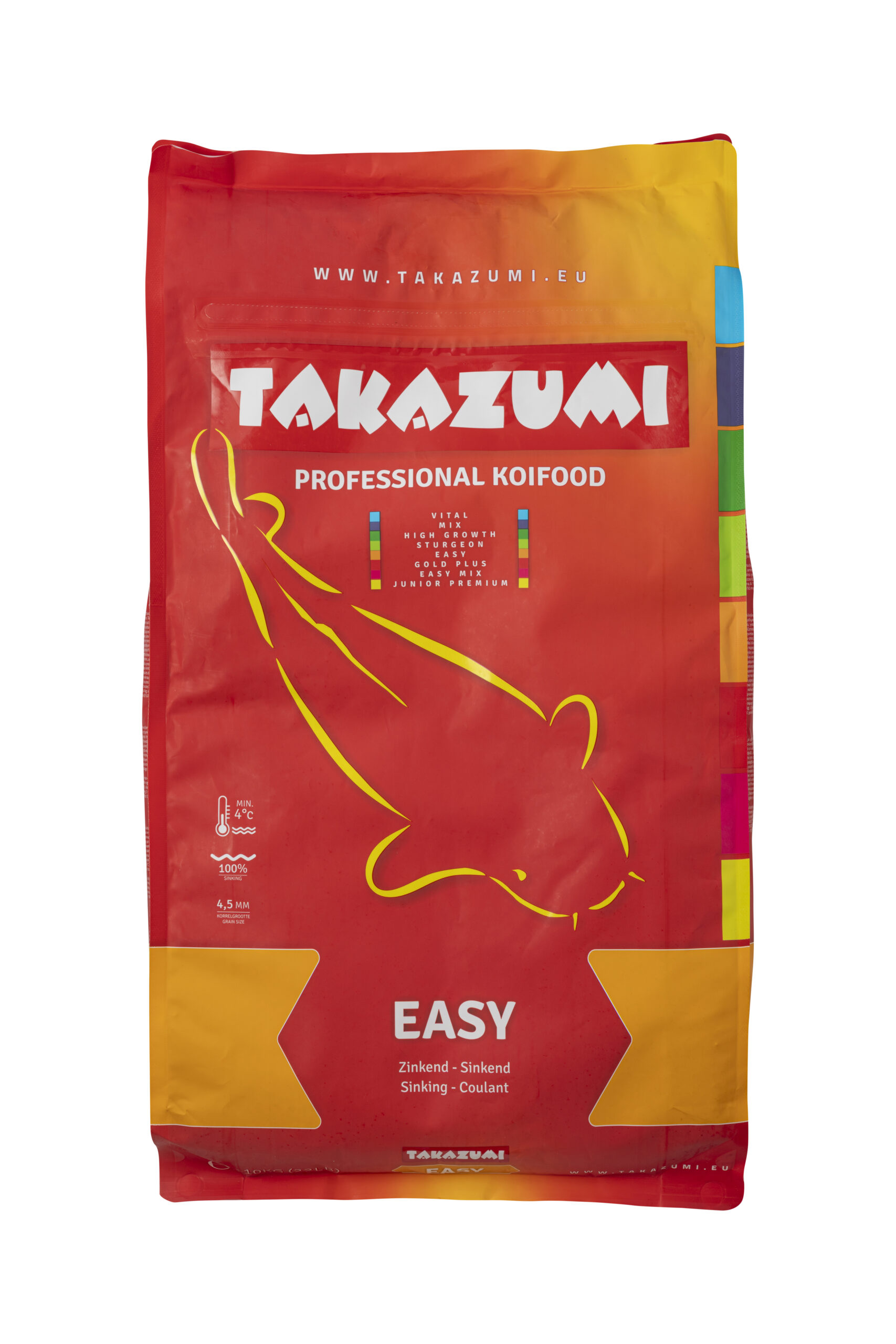 Takazumi Easy is een uitgebalanceerd professioneel kleurondersteunend basisvoer met een laag vet- en een medium proteïnegehalte en alle voedingsstoffen voor een gezond Koileven. Takazumi Easy is een zinkend voer, speciaal bestemd voor de wat minder actieve (Easy) Koi die zich onttrekt aan de jacht op de pas gestrooide korrels en dieper in de vijver wacht op wat hem toevalt.