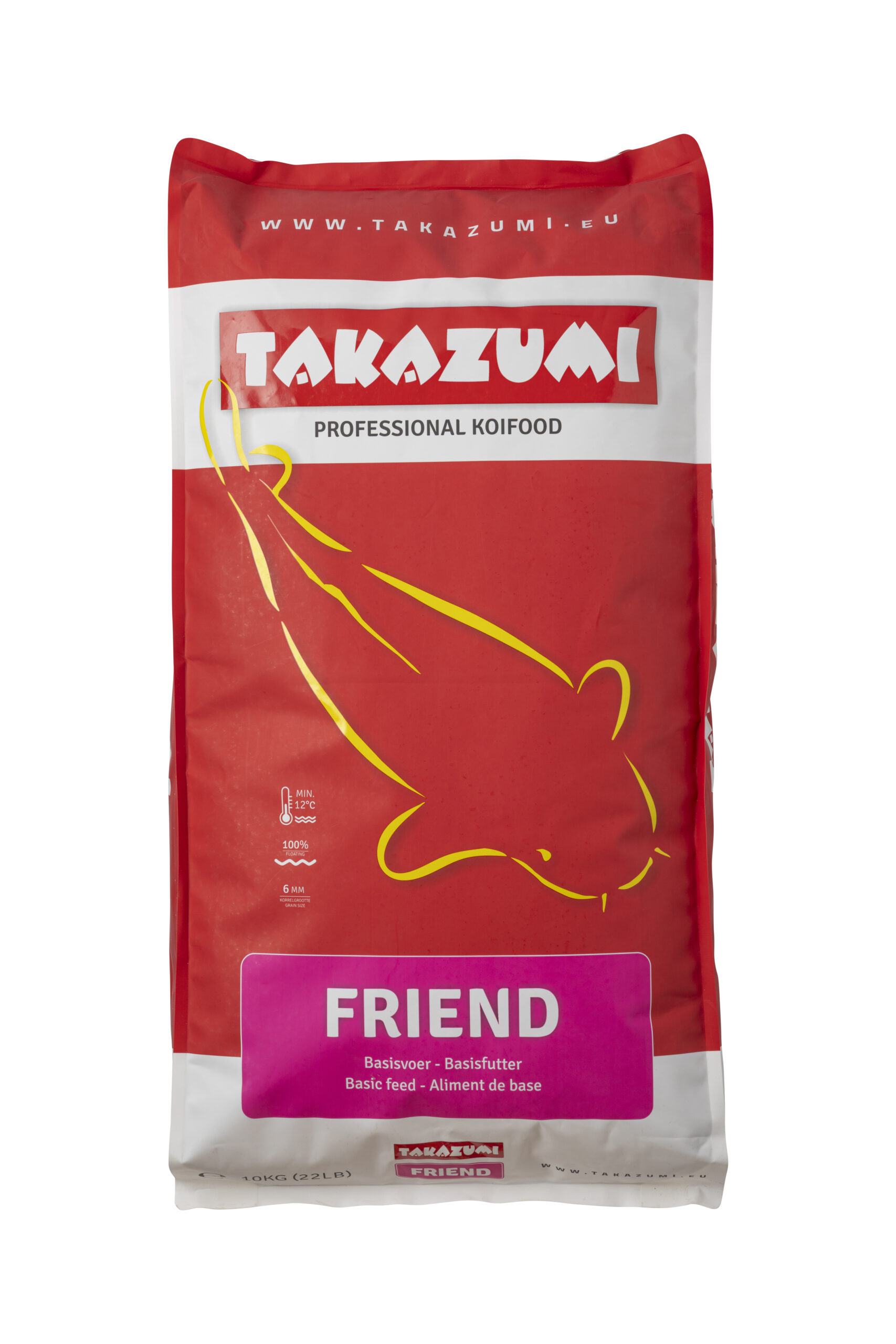 De drijvende korrels van 6 mm zijn niet alleen vriendelijk voor uw vissen, maar ook voor het vijverwater (dat vertroebelt niet) en voor het filter (dat wordt niet extra belast). Takazumi Friend kan gevoerd worden bij watertemperaturen vanaf 12oC en wordt geleverd in zakken van 10 kg.