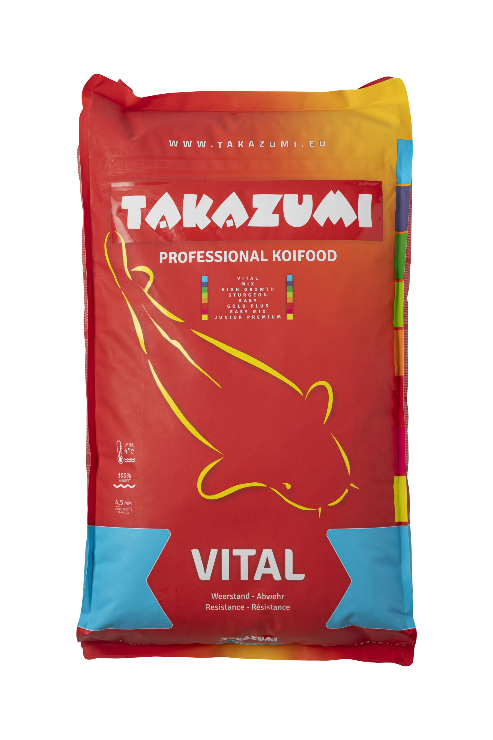 Takazumi Vital is bij uitstek te gebruiken als de conditie van de koi eens wat minder is, bijvoorbeeld na een behandeling met medicijnen of na transport – 2 tot 3 weken vital voeren is dan al voldoende – en het is ook bijzonder geschikt als wintervoer. Door deze professionele receptuur van het late najaar tot het vroege voorjaar in te zetten, beschermt u de gezondheid van uw koi.